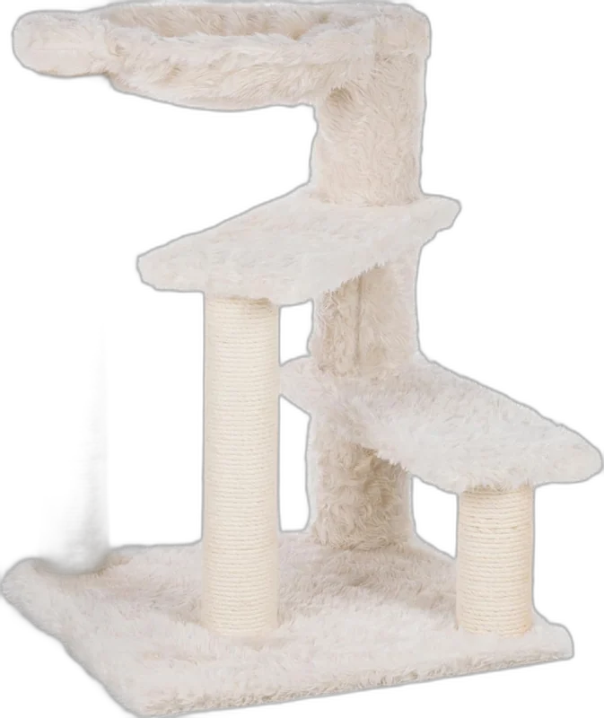 Une niche fermée en position basse complète l'offre. Elle est tapissée intérieurement de la même peluche douce, offrant un refuge confortable aux chats qui recherchent l'intimité. L'ouverture est généreuse pour un accès facile. Les 5 poteaux en sisal sont disposés à différents angles, permettant au chat de varier les postures de griffades.